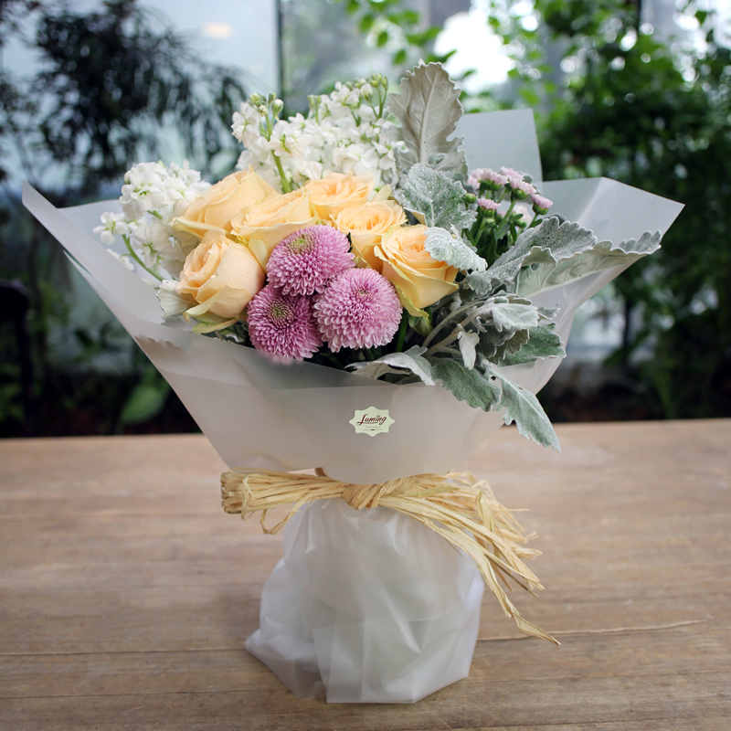 白色乒乓菊2枝,1枝莲蓬,尤加利叶1-2枝